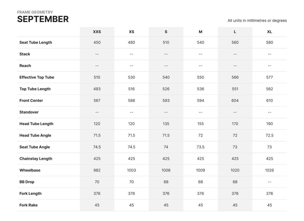 | Seat angle | 74.5 | 74.5 | 74 | 73.5 | 73 | 73 |