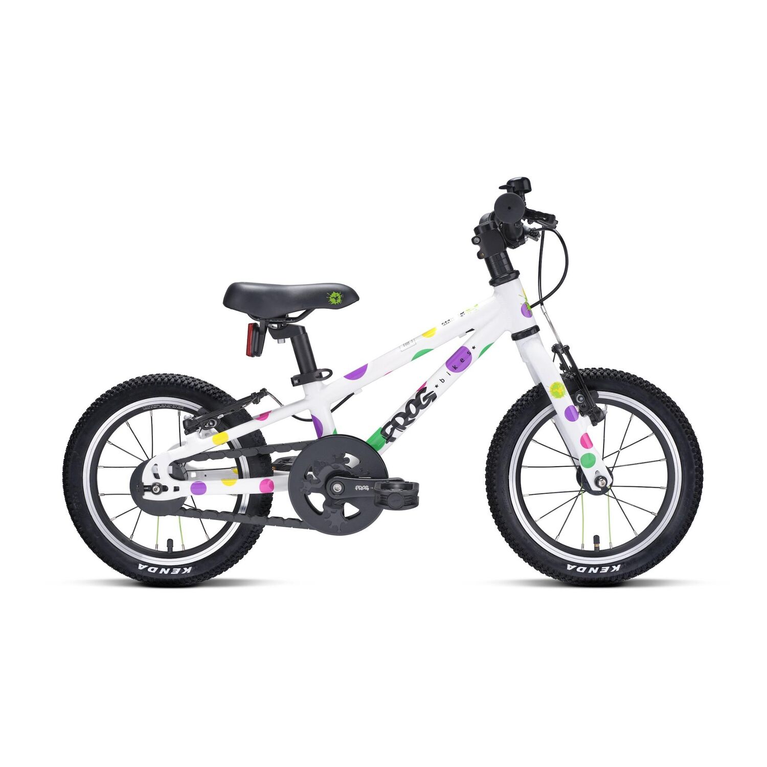 | Miscellaneous | Perfect for Growth: Adjustable handlebar height (40mm range) and toolless seat post adjustment ensures the bike grows with your child Effortless Riding: Patented Frog cranks improve pedaling efficiency and comfort, while the lightweight aluminium frame makes it easy for kids to handle and parents to carry Safety First: Small, easy-to-reach brake levers offer better control, boosting rider confidence Sleek & Practical Design: The innovative new low-profile Frog chainguard system and included Insane Chains chainguard reduces weight and enhances the bike's modern look Kid-Friendly Features: Enlarged grip ends protect little hands when riding near obstacles, and a new kickstand attachment ensures safer deployment Easy Maintenance: A redesigned lightweight aluminium chain tensioner simplifies adjustments Built to Last: Backed by a free 10-year extended warranty on the frame and forks Weight Saving: Thinner profile frame tubing saves weight over the Frog 40 Includes: Reflectors, mudguard, and bell for added safety and functionality Please note, that while not pictured, all Frog First Pedal bikes are supplied with chain guards installed to comply with ISO8098 safety standards |