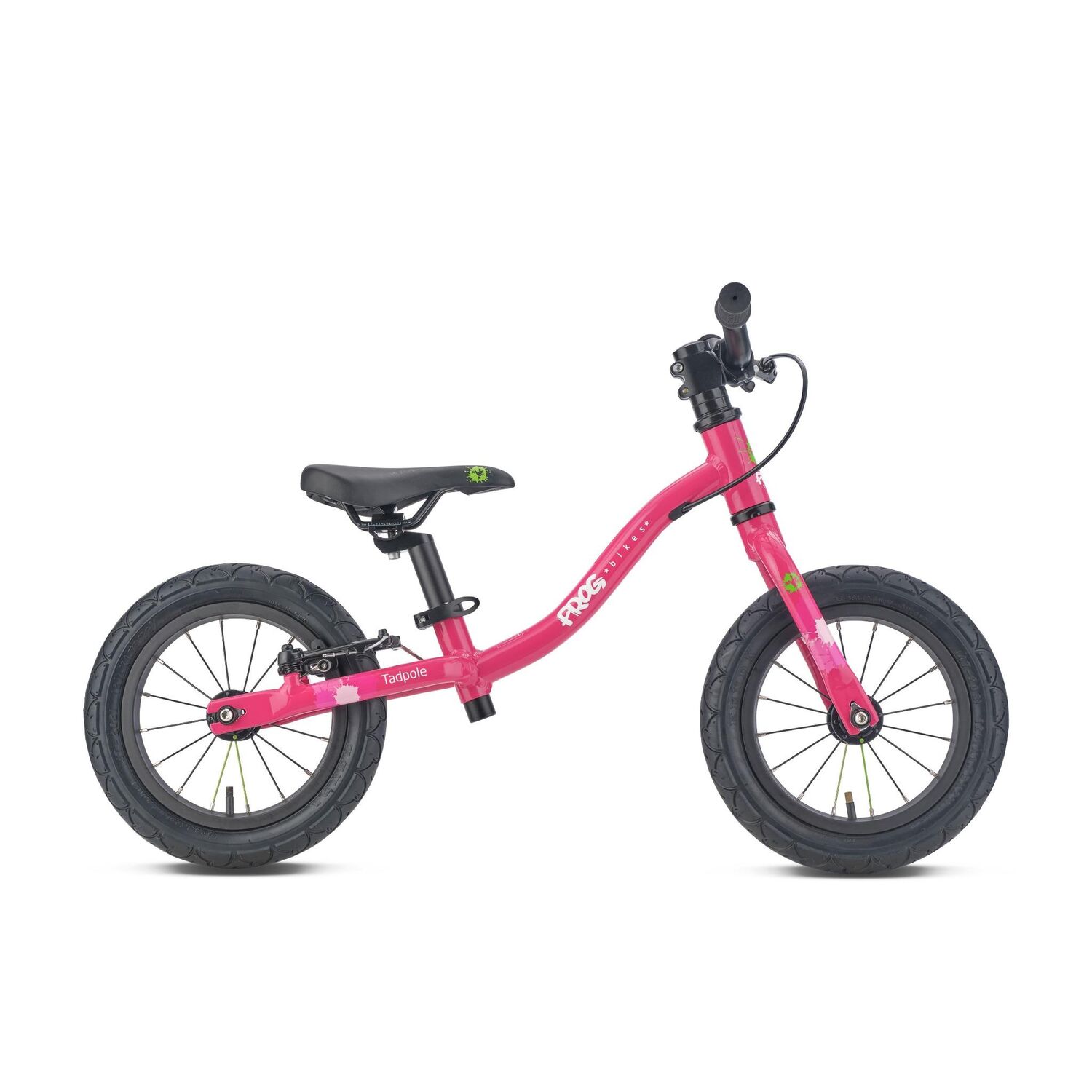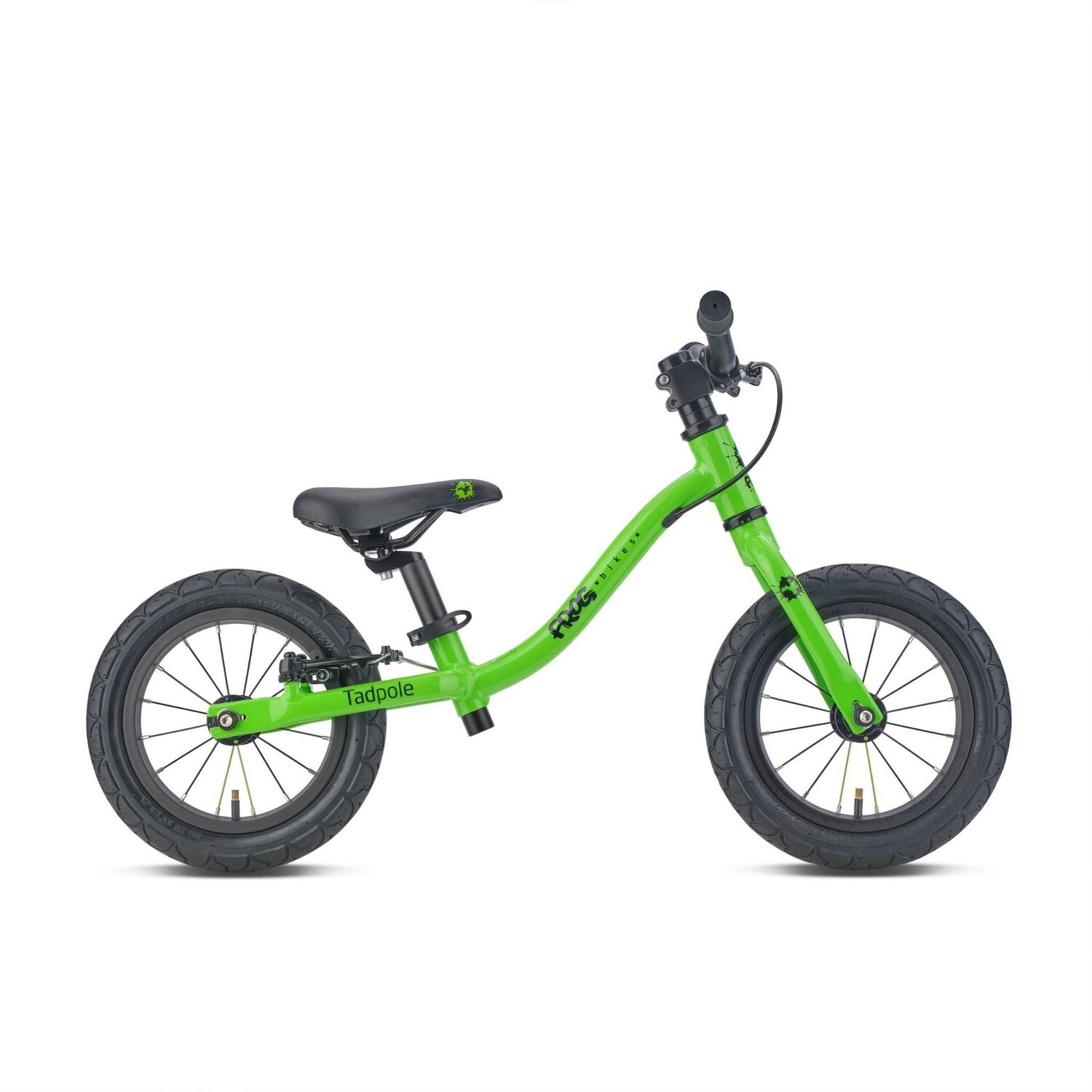| Style | The Tadpole balance bike is a great alternative to training wheels. It comes fully equipped with high-spec age-specific components, designed for comfort and longevity. The toddler-sized saddle with quick-release seat post allows for easy height adjustment as they grow and become more confident, and the Tektro brakes with small, easy-to-reach brake levers, mean better control for mini riders. It also comes with chunky tyres for maximum stability and grip, and for added security, the bike offers the added benefit of a steering lock, which acts as a safety mechanism to prevent oversteering and serious falls. Please note: Valve dust caps are not supplied with this model in order to adhere to safety regulations. Get sized for cycling success The Tadpole balance bike is suitable for 2 to 3 years with a recommended inside leg measurement of 31cm-41cm. View Frog's bike sizing guide to discover the best-sized bike for your child. https://www.frogbikes.com/en_GB/finding-the-right-size-bike-for-your-kids-fitting-guide.html |