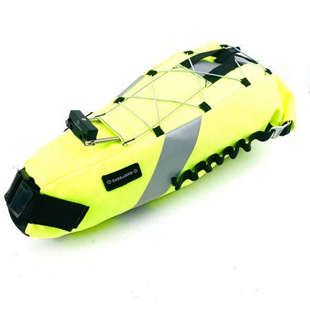 | Description | A feature packed, large capacity saddle and seatpost mounted bikepacking bag with its own support rack which makes it a cinch to use and gives dependable support. Patented quick release support allows easier one handed on/off mounting Rock solid support means no drooping onto the back wheel Minimal side to side sway when out of the saddle 1000 denier military grade Cordura for abrasion resistance and strength Multi directional reflective panels for low light safety Simple no fuss daisy chain roll top closure Mulitple rear light attachment points Wipe clean base panel acts as mud guard Re-cycled innertubes incorporated into the straps for better seatpost grip Top handle for easy on/off mounting and carrying off bike Elasticated cargo net for storing extra gear Removeable nylon liner for when its really really wet ! Maximum recommended load 3kg. For heavier loads (up to 6kg) use the supplied compression strap around the saddle rails and through the tab on the underside of the bag. Capacity: 12 - 16 litres Dimensions: 57cm long (unrolled) x 28 cm wide x 15 cm deep Weight: Bag - 335 grams Support - 200 grams Liner - 65 grams |