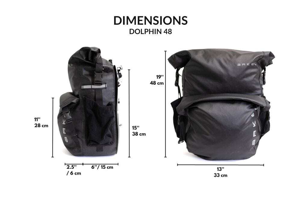 | Description | Arkel's Dolphin Panniers offer a reliable touring companion for your adventures. A well-rounded bag also for daily commutes or months-long expeditions. - Organise your belonging in 2 large waterproof independant roll top compartments, plus an open space between the 2 main volumes. - Pack your sandals on the mesh pockets on each side. - Keep your stuff dry no matter how bad the sky is pouring on you, with waterproof fabric and taped seams. - Ride blissfully on bumpy roads, thanks to the unique Cam-Lock Attachment System. Fabric: Ripstop Nylon fabric 420D with PU coating. - Toploader bag with sewn and taped seam technology. - Interloc System that creates a watertight seal by folding the closures one over the other. - Front storage pouch that features small laser cut holes at the bottom for drainage. - Equipped with Arkel's Cam-Lock attachment system. - Weight: 2.2 kg (4.8 lbs)/pair - Volume: 48 L (2930 cu. in.)/pair We proudly offer a lifetime guarantee on manufacturer defects for your Arkel product. This guarantee covers: the workmanship, stitching, and pieces such as the aluminium hooks, rails, nuts and screws, and inner stiffening backplate. |